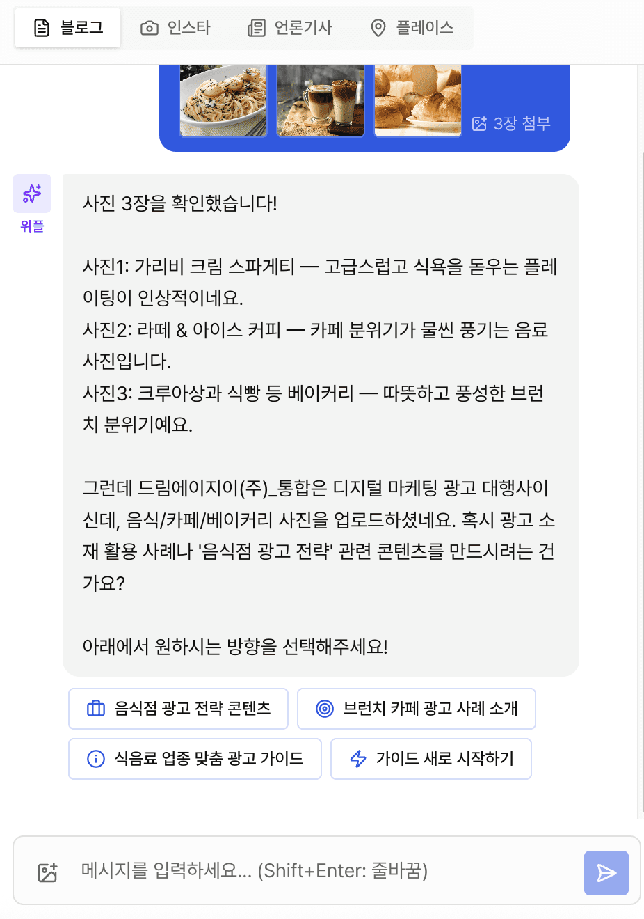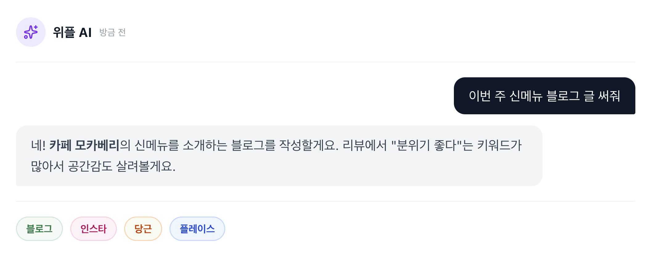 채팅 한 번으로 블로그·인스타·당근·플레이스 콘텐츠 완성