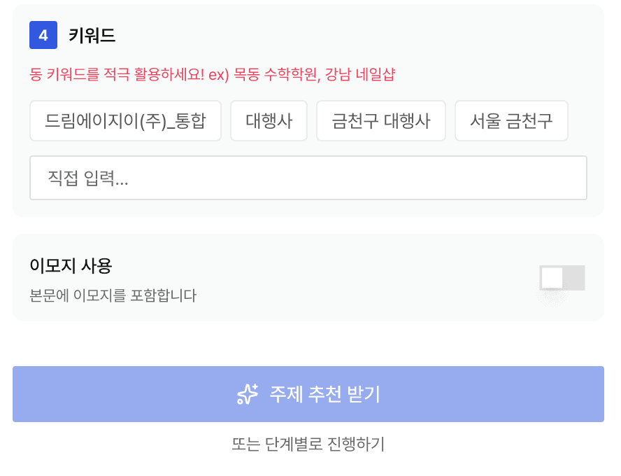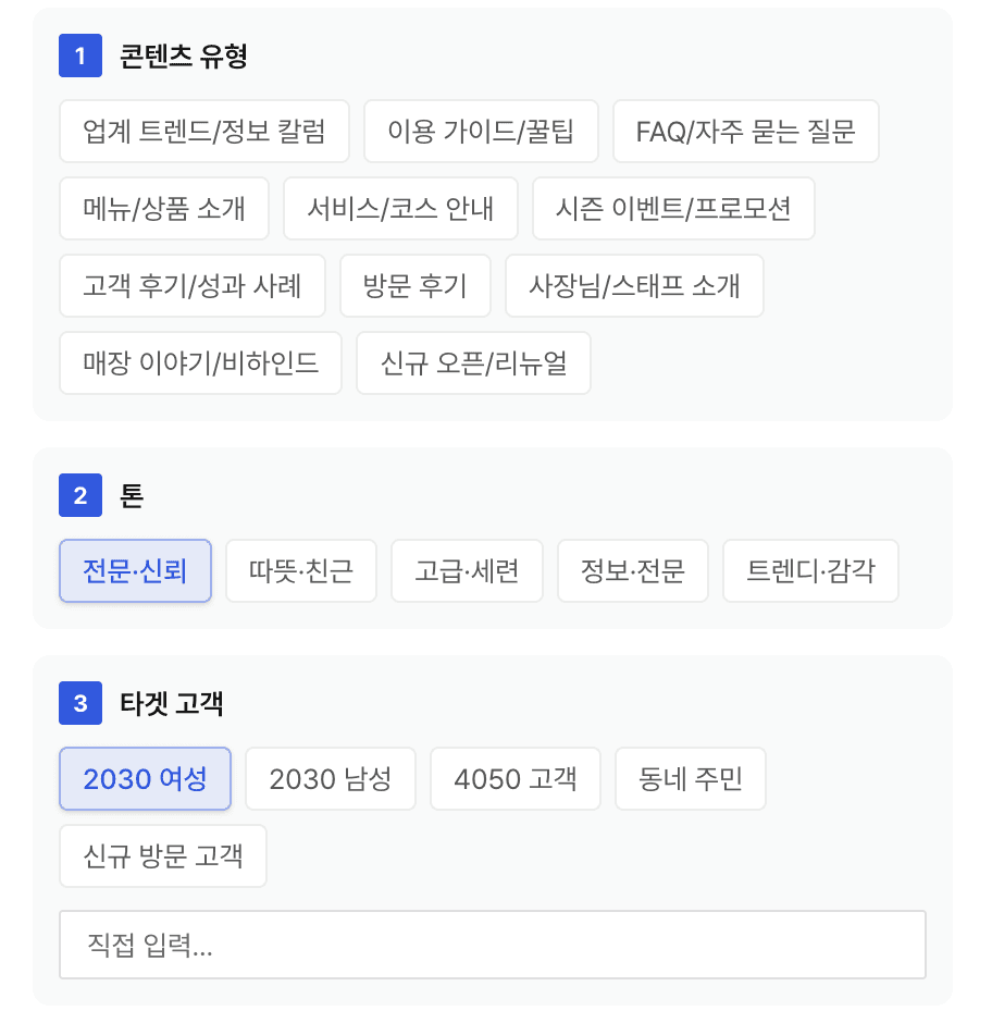 콘텐츠 유형 · 톤 · 타겟 고객 · 키워드까지 단 한 번에 설정 완료