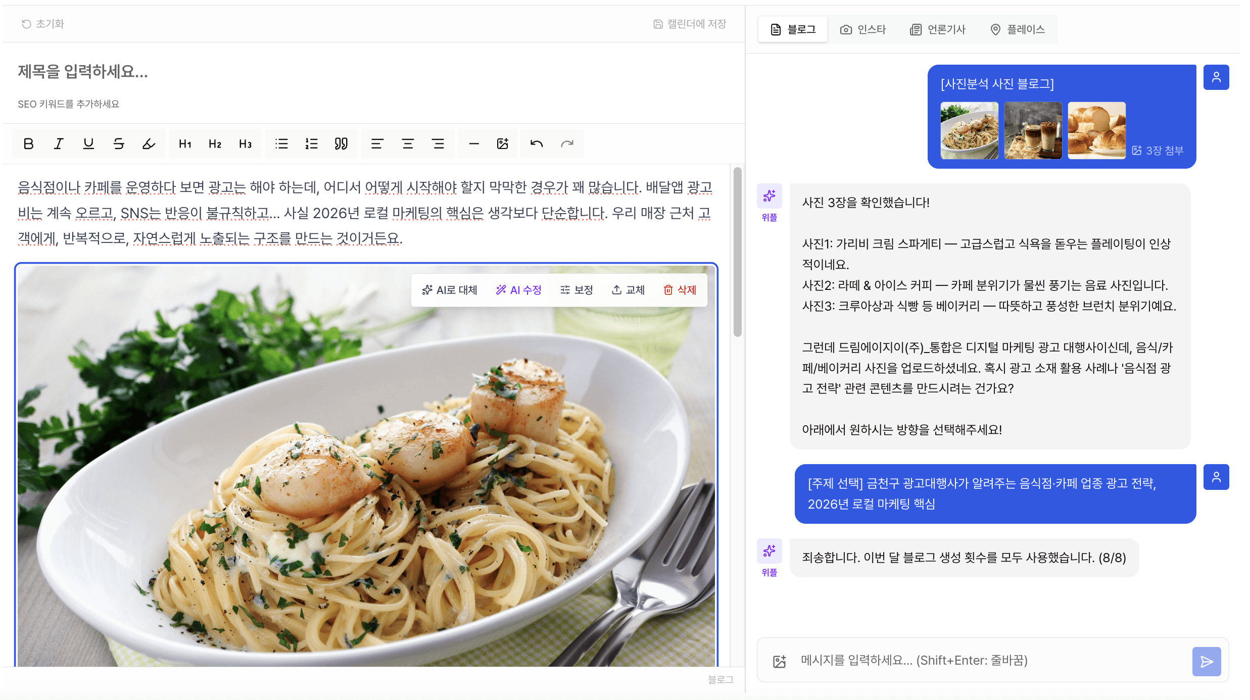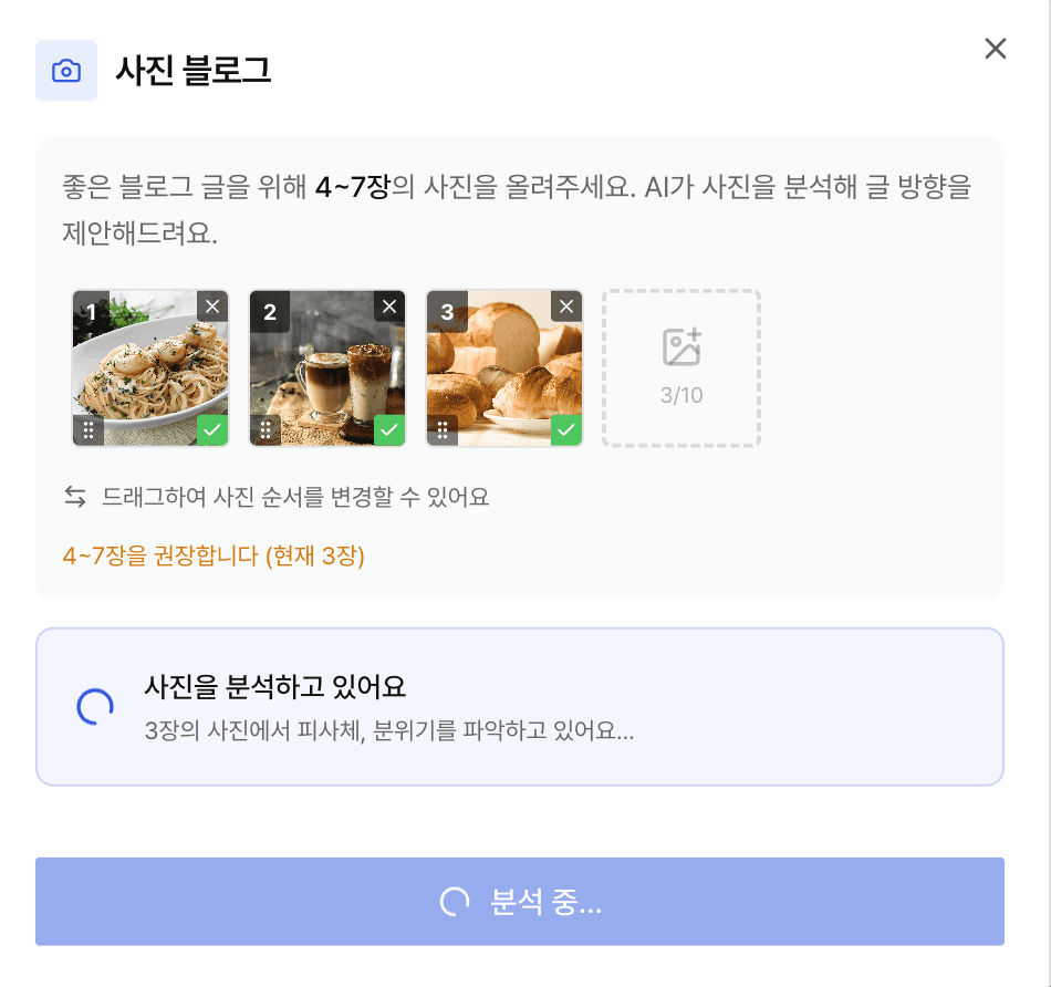 사진만 올리면 AI가 분석하여 키워드 노출 중심으로 자동으로 포토 블로그를 생성할 수 있습니다